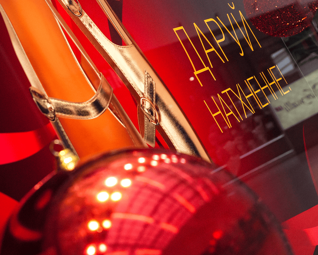 Центральные подиумы — это метафоры внутреннего мира каждого из нас, подчёркивающие уникальность и неповторимость. Акцентные элементы в золотом цвете — гирлянды, кубы и элегантные пары туфлей придают композиции праздничное сияние и отсылают к наступающему году Огненной Лошади.